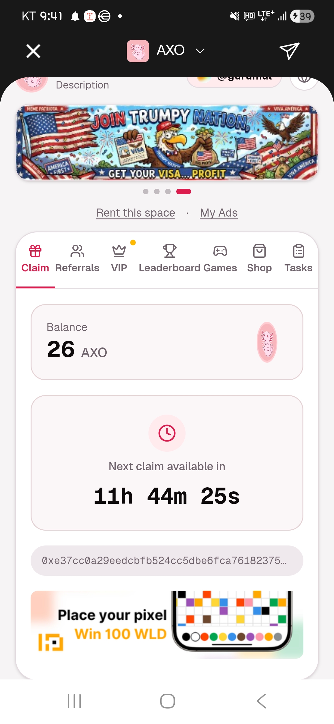 위 화면은 월드아이디 지갑연결과 AXO의 기몬 클레임 화면과 레퍼럴 화면입니다..